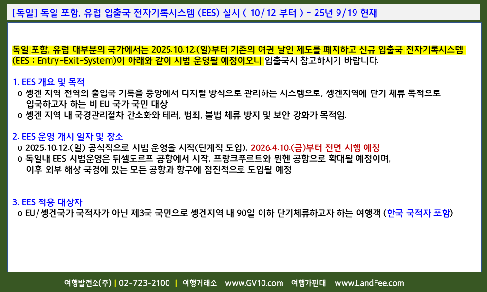 | [유럽] EU 29개국, 출입국관리시스템 (EES) 도입 및 시행 (10/12 부터) - 25년 9/19 현재 (0) | 2025.09.22 |