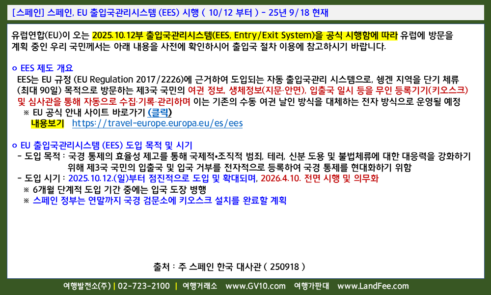 | [유럽] EU 29개국, 출입국관리시스템 (EES) 도입 및 시행 (10/12 부터) - 25년 9/19 현재 (0) | 2025.09.22 |
