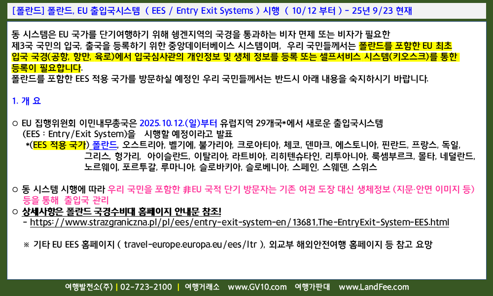 | [그리스] 그리스 포함, EU 입출국 전자기록시스템 ( EES ) 실시 ( 10/12 부터 ) - 25년 9/23 현재 (0) | 2025.09.25 |