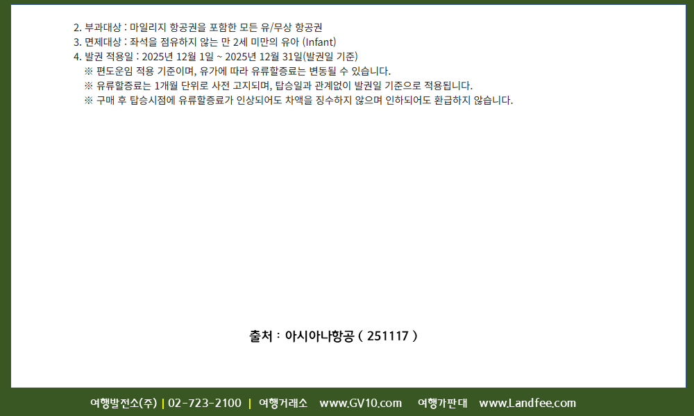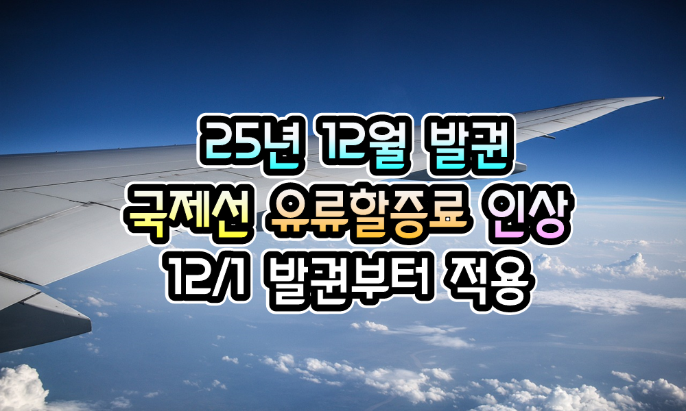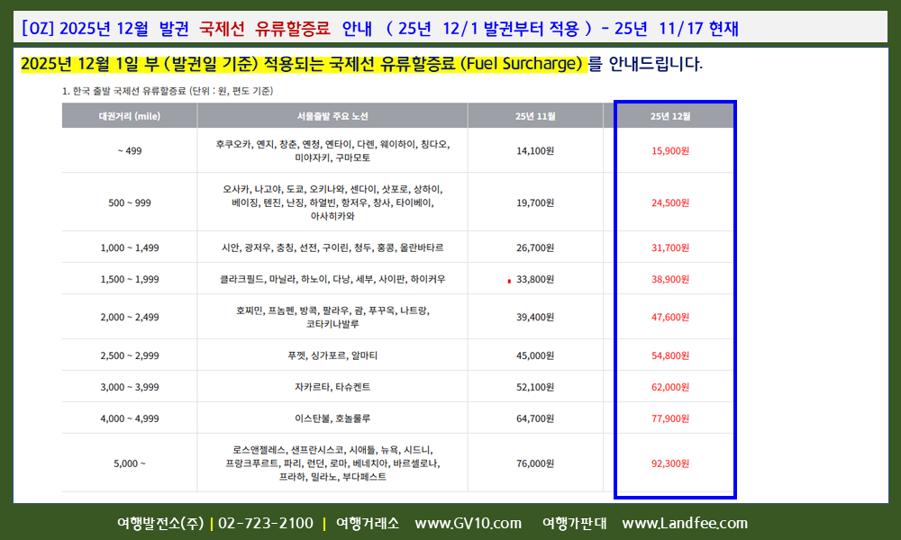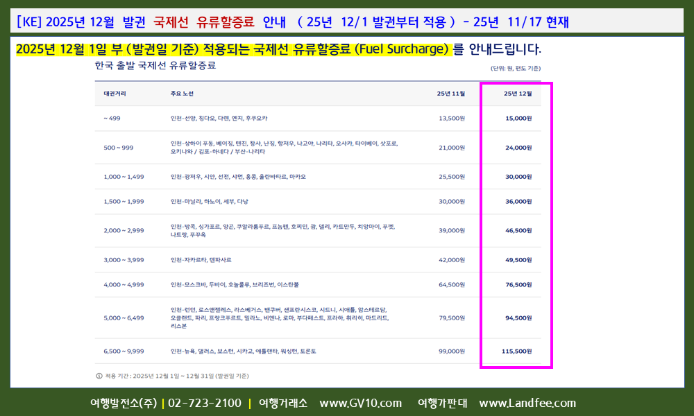 | [KE/OZ] 2026년 1월 발권 국제선 유류할증료 안내 ( 26년 1/1 발권부터 적용 ) - 25년 12/16 현재 (0) | 2025.12.17 |