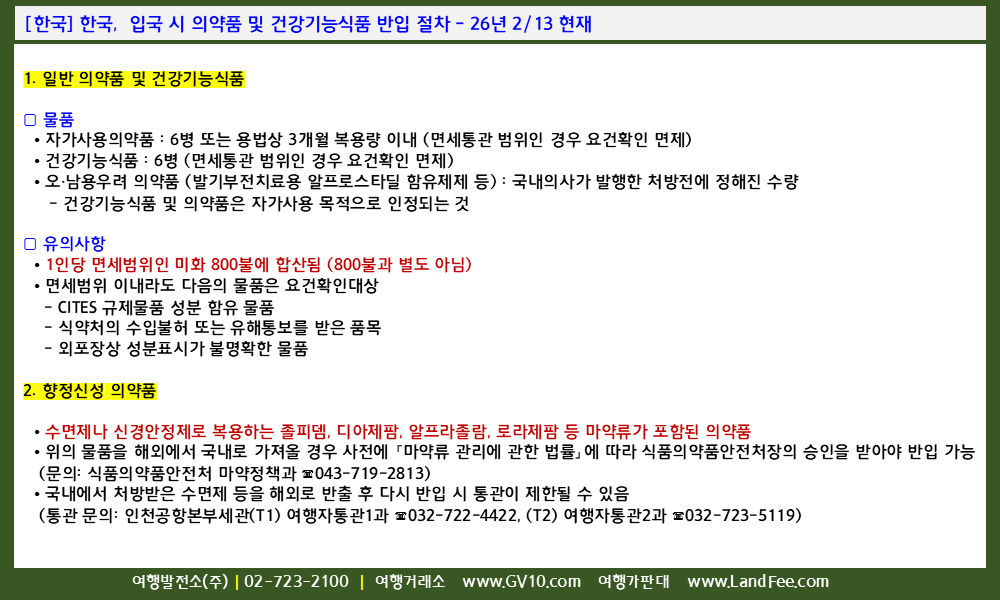 | [한국] 한국, 「여행자 호흡기 감염병 검사 서비스」 전국 13개 공항·항만으로 확대 시행 ( 26년 2/10 부터 ) - 26년 2/6 부터 (1) | 2026.02.10 |